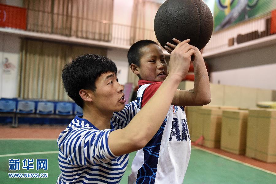 2月11日,张勤(左)在老家附近的一个体育馆里教石一石布投篮。春节将至,位于太行山脚下的山西省长治市长子县南郜村迎来了五位“稀客”,来自四川凉山彝族自治州的彝家孩子额其尔布、曲比日付、阿余时日、石一拉布和石一石布跟着他们的支教老师张勤回到老家过年。五个大凉山区的孩子在张勤老师的带领下第一次走出大山,亲眼看到外面世界的精彩,感受到汉族年的热闹红火。今年23岁的张勤原本在一家煤矿做销售工作,每个月有5000多元的工资,但为了支教的理想,2014年9月他放弃了工作,来到了大凉山义务支教。张勤徒步走访了上百个村寨,最后停在了尼勒觉村的两顶帐篷前。“打开门帘,里面50多个黑压压的脑袋,回头冲着你笑,当时心想,就这儿了。”张勤说。帐篷是前几任支教老师留下的,风一吹就倒,很不安全。张勤拿出自己工作两年攒下的10万块钱,为孩子们盖教室。在朋友和公益组织的帮助下,一所崭新的、带篮球场的学校修建了起来。张勤教孩子们语文、音乐和体育,同时也是他们的班主任,他翻过一座又一座的大山挨家挨户做家访,摸清了全班60来名学生的家庭状况。“彝家的孩子很聪明,又有音乐和体育的天赋,但是家长不重视教育,许多孩子为了放羊而辍学,来这的老师也待不住,大多数几个月就走了,”张勤说,他最担心的仍然是大凉山里那些至今失学的孩子们,“过完年,和我一起的另外两位支教老师都要走了,到时候就得我一个人带100多个孩子。”如今,他最大的希望就是能有更多人来帮助那些失学的孩子。新华社记者 范敏达 摄