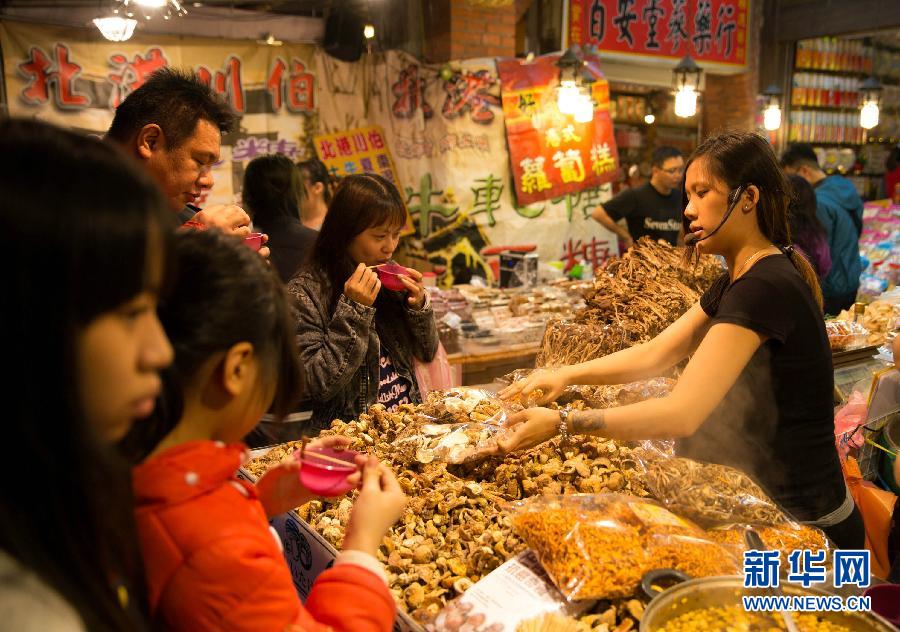 2月15日晚,在台北市迪化街上,一名店主在促销汤料。春节临近,台北市年货一条街——迪化街的夜晚人头攒动,热闹非凡。 新华社记者 金立旺摄