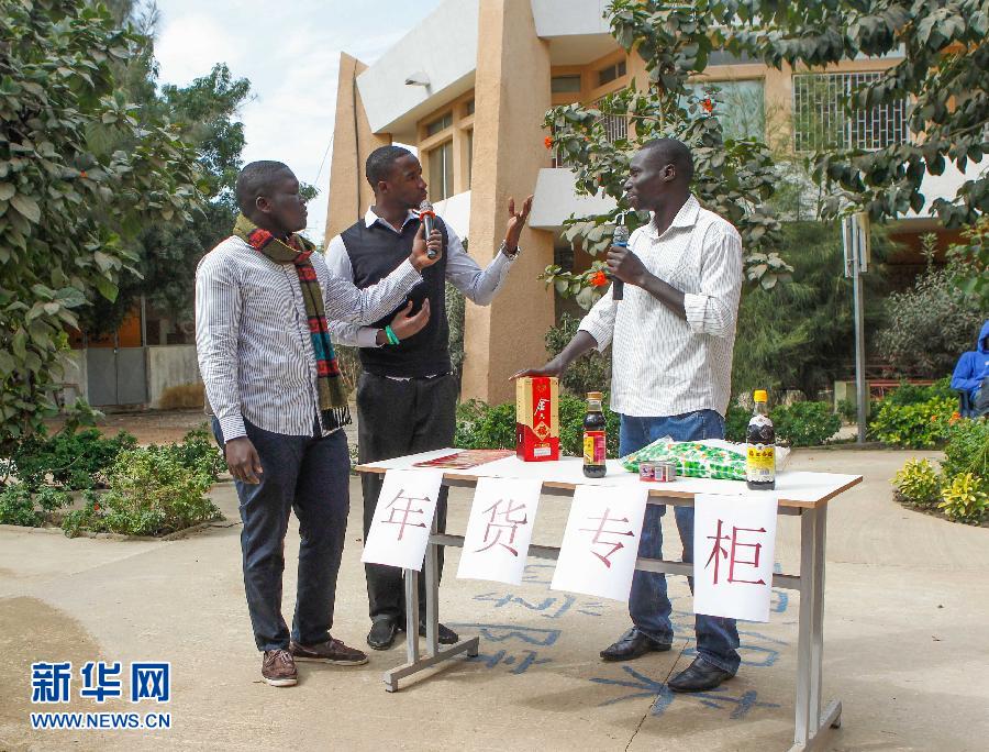 2月14日,在塞内加尔达喀尔大学,塞内加尔学生表演小品《年货是什么》。当日,塞内加尔达喀尔大学孔子学院举办庆新春活动,百余名达喀尔大学的师生与当地华人华侨一同品茶、煮饺子、了解年货和压岁钱等中国春节常识,领略中国文化的魅力。孔子学院的塞内加尔学生与当地武术协会的会员还表演了歌曲、小品、武术等节目,向观众展示了自己对于中国文化的理解。新华社记者李京摄
