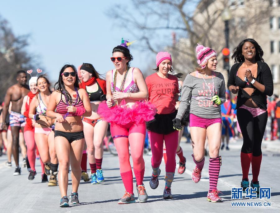 2月15日,在美国首都华盛顿,人们身着内衣参加趣味慈善跑步活动。当日,华盛顿国会前举行了一场别开生面的跑步活动。参赛者在零下九摄氏度的严寒天气中,身着粉红色内衣跑完全程。该活动旨在为儿童肿瘤基金募资。新华社记者鲍丹丹摄