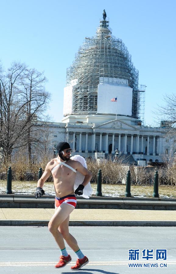 2月15日,在美国首都华盛顿,一名男子身着内衣参加趣味慈善跑步活动。当日,华盛顿国会前举行了一场别开生面的跑步活动。参赛者在零下九摄氏度的严寒天气中,身着粉红色内衣跑完全程。该活动旨在为儿童肿瘤基金募资。新华社记者鲍丹丹摄