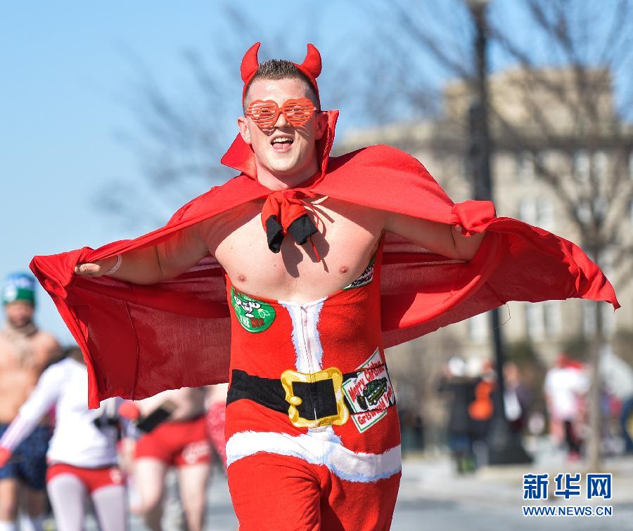 2月15日,在美国首都华盛顿,一名男子身着内衣参加趣味慈善跑步活动。当日,华盛顿国会前举行了一场别开生面的跑步活动。参赛者在零下九摄氏度的严寒天气中,身着粉红色内衣跑完全程。该活动旨在为儿童肿瘤基金募资。新华社记者鲍丹丹摄