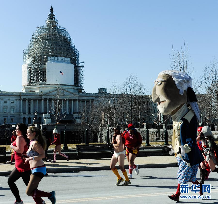 2月15日,在美国首都华盛顿,人们身着内衣参加趣味慈善跑步活动。当日,华盛顿国会前举行了一场别开生面的跑步活动。参赛者在零下九摄氏度的严寒天气中,身着粉红色内衣跑完全程。该活动旨在为儿童肿瘤基金募资。新华社记者鲍丹丹摄