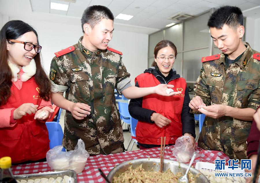 2月15日,合肥市蜀山区文博苑社区的志愿者和消防战士们一起在营房内包饺子。当日,安徽省合肥市蜀山区文博苑社区的志愿者们来到临近的天鹅湖消防中队的官兵营区,为子弟兵们送上新春祝福。 新华社记者 郭晨 摄