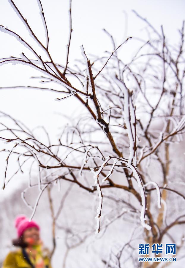 2月17日,游客在长白山北坡景区欣赏“树挂”。 新华社记者 王昊飞摄