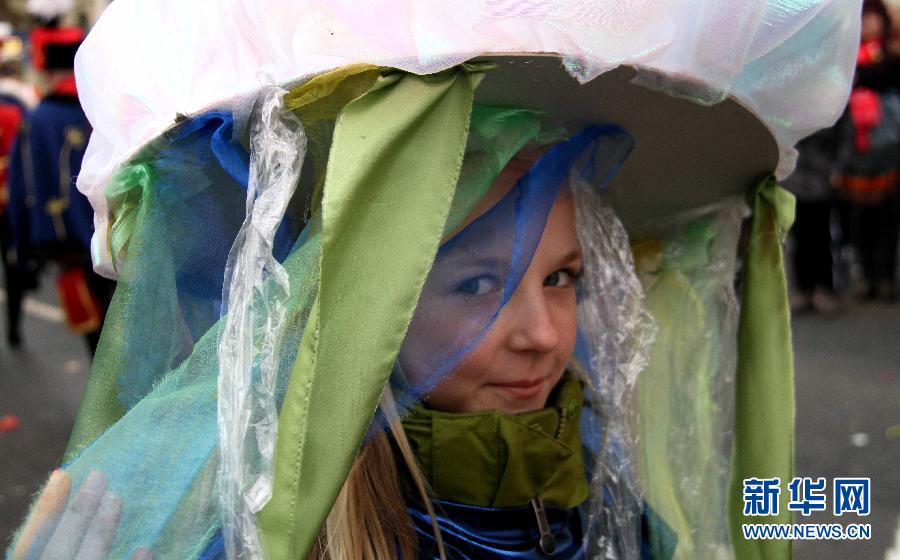 2月16日,在德国美因茨,一个小女孩参加“玫瑰星期一”大游行。 当日,德国美因茨举行“玫瑰星期一”大游行,庆祝狂欢节。新华社记者申正宁摄