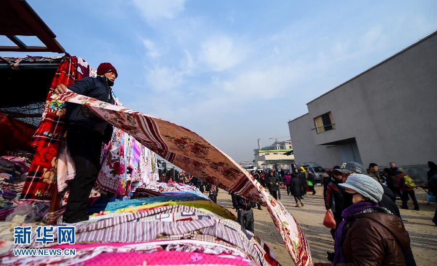 2月16日,吉林省延吉市兴安村大集上,一名商贩在展示床单被褥等传统年货。新华社记者 王昊飞摄