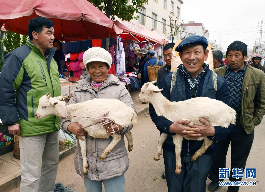 2月11日,一对农民夫妻在集市上买了两只羊抱回家。羊年新春佳节将至,云南省寻甸回族彝族自治县羊街村集市热闹非凡,人们纷纷前来赶集,购买年货,欢度羊年春节。 新华社记者杨宗友摄