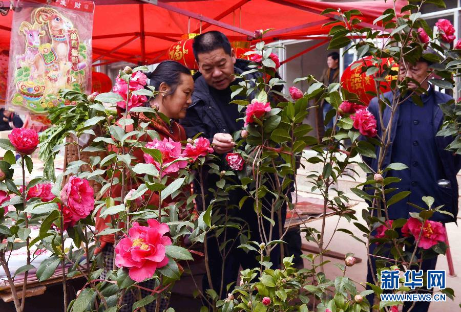 2月11日,几位农民在集市上选购茶花盆景。羊年新春佳节将至,云南省寻甸回族彝族自治县羊街村集市热闹非凡,人们纷纷前来赶集,购买年货,欢度羊年春节。 新华社记者杨宗友摄