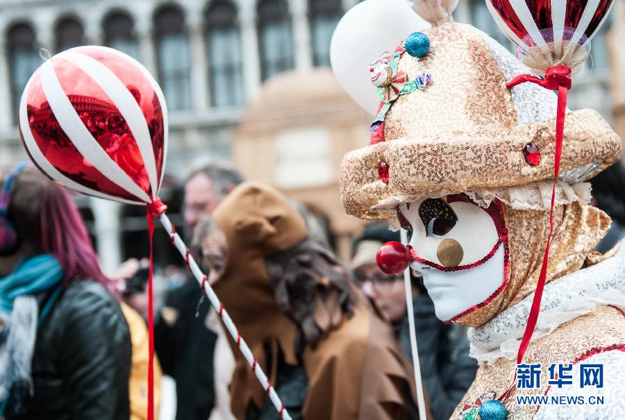 2月13日,在意大利威尼斯,“蒙面艺人”参加狂欢节庆祝活动。  新华社发