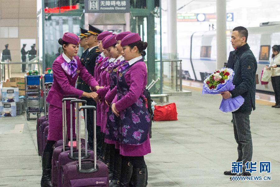 2月13日,在重庆火车北站的站台上,段鸿飞手捧鲜花和礼物默默地站在妻子谢寒梅(左一)乘务班组的后面,等待妻子忙完工作。