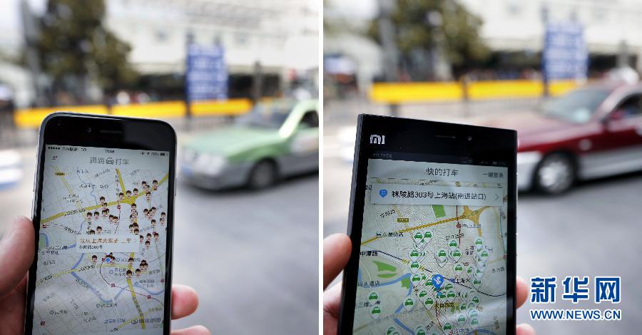 2月14日,乘客在上海火车站分别使用快的打车与滴滴打车软件打车。当日,快的打车与滴滴打车联合发布声明称实现战略合并,新公司实行联合CEO制度,业务依旧各自独立。双方称,新公司将实施联合CEO制度,滴滴打车CEO程维及快的打车CEO吕传伟将同时担任联合CEO。两家公司在人员架构上保持不变,业务继续平行发展,并将保留各自的品牌和业务独立性。新华社记者 丁汀 摄