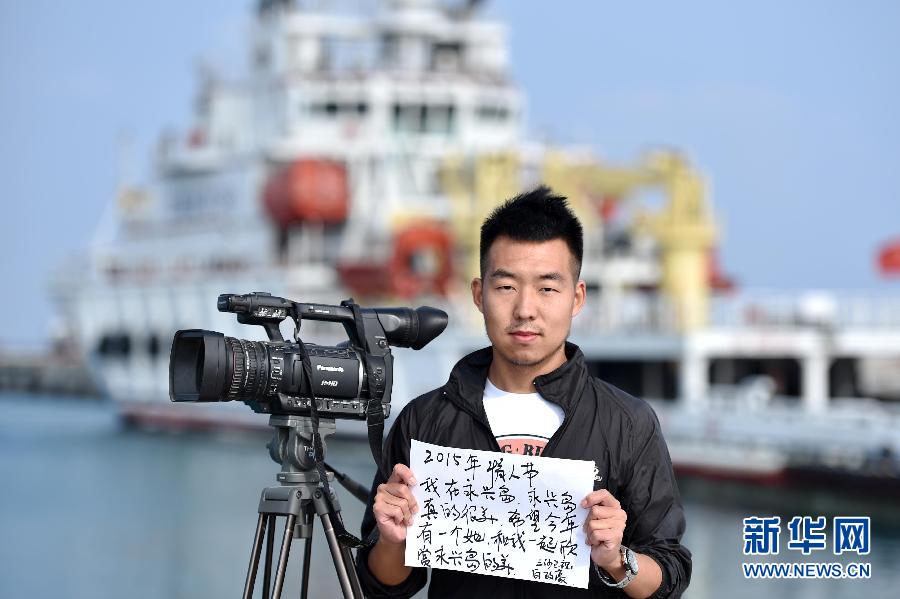 2月14日,三沙卫视记者白政豪在渔业码头展示自己的情人节愿望——“我在永兴岛,永兴岛真的很美,希望今年有个她和我一起欣赏永兴岛的美”。由于工作性质特殊,记者小白依然没有找到心中的那个她,小白最大的愿望就是和她一起在浪漫三沙看海。新华社记者 赵颖全摄