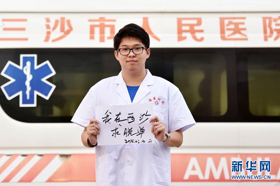2月14日,在西沙永兴岛值班的三沙市人民医院护士王开石展示情人节愿望——“我在西沙求脱单”。第一次在岛上值班的王开石,今年最大的愿望就是不再单身。新华社记者 赵颖全摄