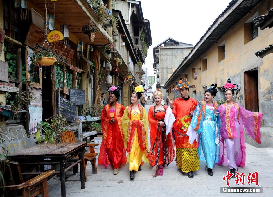 2月14至15日,“财神爷”携“武媚娘”来到四川一景区,向游客和当地民众拜新年派发红包,迎接新春佳节的到来。中新社发 刘忠俊 摄