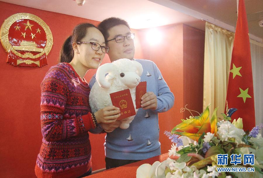 2月14日,情人节,一对新人在山东省青岛市市南区民政局婚姻登记处拿着刚领到的结婚证合影。 新华社发(林小木 摄)