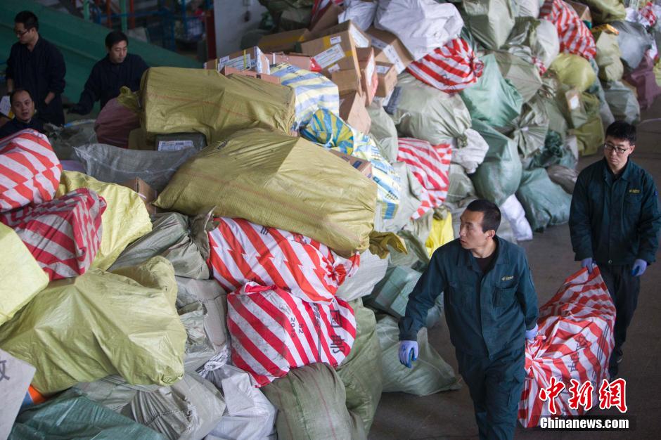 2月13日,山西太原,邮政工作人员正在处理各类快递包裹。随着春节即将来临,社会民营累快递公司纷纷停止了营业,各类包裹只得涌入邮局,使得包裹暴增。据山西邮政部门工作人员介绍,最近一周,太原邮区中心局日均接发邮件总包6万多袋,最高峰值近8万袋;日均处理散件邮件近9万件,最高峰值突破12万件,日处理量比平日里增加了一倍。中新社发 张云 摄