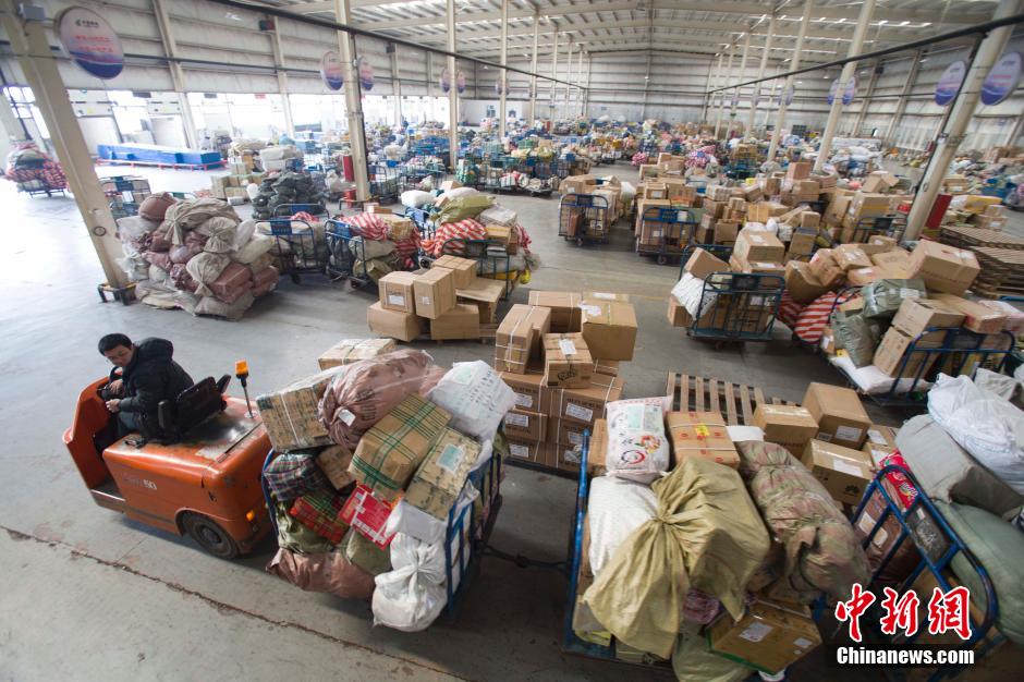 2月13日,山西太原,邮政工作人员正在处理各类快递包裹。随着春节即将来临,社会民营累快递公司纷纷停止了营业,各类包裹只得涌入邮局,使得包裹暴增。据山西邮政部门工作人员介绍,最近一周,太原邮区中心局日均接发邮件总包6万多袋,最高峰值近8万袋;日均处理散件邮件近9万件,最高峰值突破12万件,日处理量比平日里增加了一倍。中新社发 张云 摄