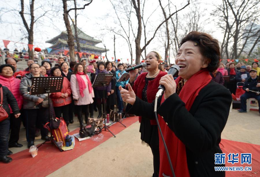 2月14日,在西安市兴庆宫公园,歌唱家贠恩凤(右)和歌唱爱好者们一起演唱歌曲。春节前夕,年过七旬的歌唱家贠恩凤来到西安市兴庆宫公园,与歌唱爱好者们一同为市民义务演唱。据了解,贠恩凤退休后每年仍坚持演出数十场,部队、学校、医院、社区都是她演出的舞台。60余载的歌唱生涯中,贠恩凤参加各类演出5000余场次,《山丹丹开花红艳艳》《南泥湾》等歌曲更是久唱不衰。新华社记者 李一博 摄