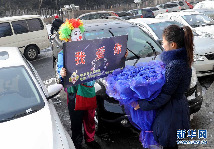 夸张的表情、花哨的服饰、蹩脚的步伐——情人节临近,一名小丑穿梭在黑龙江哈尔滨的大街小巷,替一对对爱侣送去鲜花。扮演小丑的人叫徐鸿泽,是一个90后小伙。