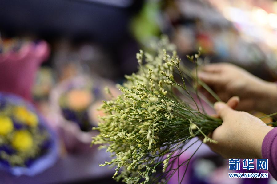 2月13日晚,澳门一家花店店员忙着包扎花束。情人节前夕,澳门花店人员通宵达旦包扎花束,迎接情人节到来。 新华社记者张金加摄