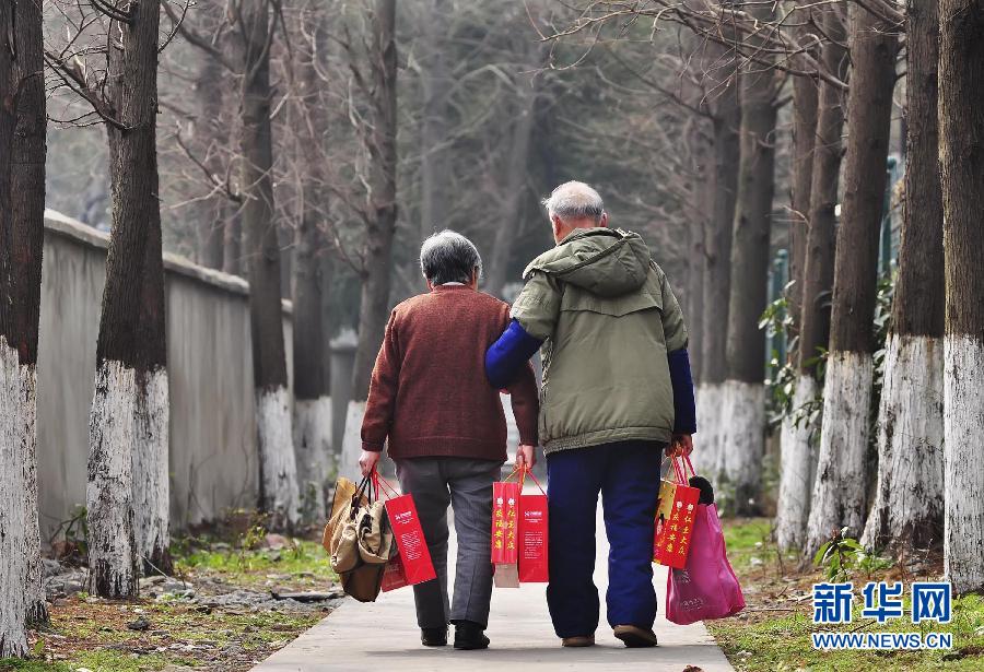 2月14日,情人节,在浙江省宁波市镇海区,年过八旬的俞全洪老人(右)搀扶着老伴,走在购物回家的路上。 新华社发(胡学军 摄)