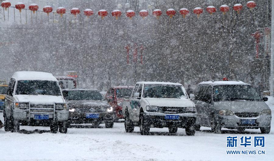 2月13日,车辆行驶在雪中的新疆阿勒泰地区布尔津县城街头。受寒冷气流影响,当日凌晨开始,新疆阿勒泰地区遭遇降雪天气,降雪给牧业生产和当地居民出行带来不便。 新华社发(巴合提别克 摄)