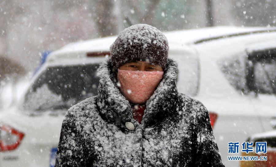 2月13日,在新疆阿勒泰地区布尔津县城,市民冒雪出行。受寒冷气流影响,当日凌晨开始,新疆阿勒泰地区遭遇降雪天气,降雪给牧业生产和当地居民出行带来不便。 新华社发(巴合提别克 摄)