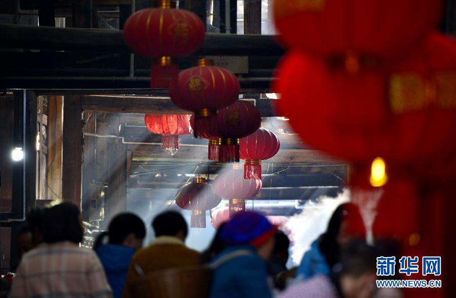 2月13日,阳光透进湖北宣恩庆阳古街,一名小孩被家长扛在肩上在庆阳古街赶集。当日是湖北恩施土家族苗族自治州宣恩县庆阳古街春节前的最后一个赶集日,人们从四面八方汇聚于此,为即将到来的羊年储备过年物资。庆阳古街始建于清朝乾隆年间,占地面积2000余平方米,每逢农历二、五、八举行乡村集市。这里是昔日出入湘、鄂、渝“盐花古道”的隘口,在这里可以品味土家族典型的建筑、商贸和集镇文化。新华社发(宋文 摄)