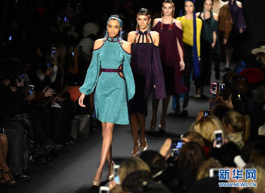 2月13日,在美国纽约林肯中心,模特在纽约时装周MONGOL时装发布会上走秀。当日,时装品牌MONGOL在2015纽约秋冬时装周上展示今年将推出的时尚新品。 新华社记者王雷摄