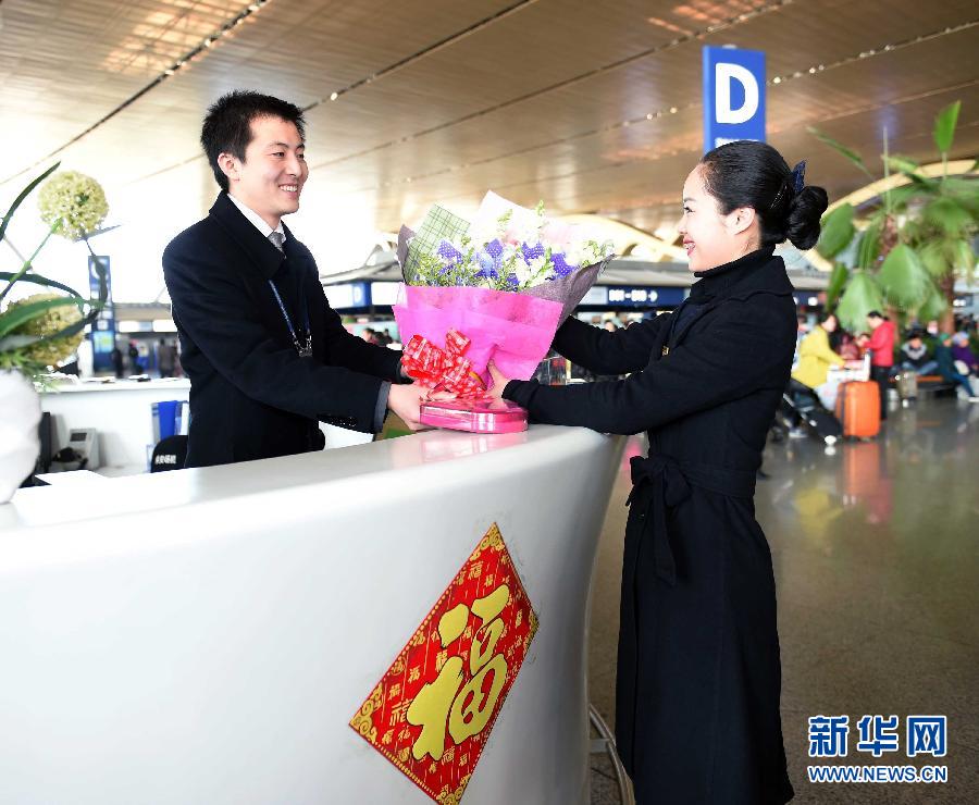 2月13日,昆明机场地服公司的胡璐向航站区管理中心旅服部问讯台的男友蔡鹏欢送上鲜花。蔡鹏欢每天笑对前来问讯的旅客,耐心解答乘客提出的疑难问题,谈及自己从事的服务工作,蔡鹏欢羞涩地说这都得益于女朋友。原来昆明机场地服公司礼仪培训部的胡璐是小蔡的礼仪老师,高大帅气、文质彬彬、聪明好学的蔡鹏欢在培训期间赢得了胡璐的芳心,培训结束后两人相爱了。春运期间,工作在云南昆明长水国际机场的几对夫妻和情侣舍小家为大家,相互理解和支持,全身心投入到各自的岗位上,为南来北往的旅客和机场飞行安全服务。2月13日这一天,在机场党委组织的关爱活动中,丈夫为妻子送来巧克力和鲜花,妻子给丈夫带来浓浓的温情和祝福,相知相爱的情感溢满机场。新华社记者 杨宗友摄