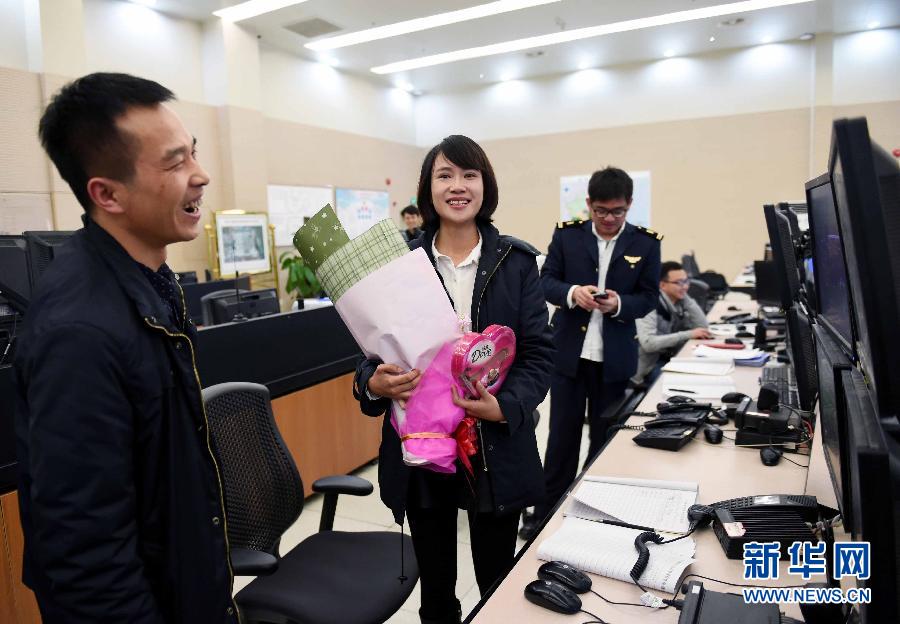 2月13日,飞行区管理中心运行管理部指挥室岗位上的杨颖抱着爱人王亚帅(左)送来的鲜花。同为飞行区管理中心运行管理部指挥室的王亚帅和妻子杨颖,也是聚少离多,他们指挥室的职责是指挥飞机停靠、进出港等30个保障环节的协调保障工作。春运期间,工作在云南昆明长水国际机场的几对夫妻和情侣舍小家为大家,相互理解和支持,全身心投入到各自的岗位上,为南来北往的旅客和机场飞行安全服务。2月13日这一天,在机场党委组织的关爱活动中,丈夫为妻子送来巧克力和鲜花,妻子给丈夫带来浓浓的温情和祝福,相知相爱的情感溢满机场。新华社记者 杨宗友摄