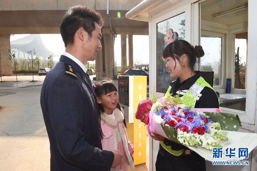 2月13日,昆明机场场区管理中心交通管理部的张财进带着女儿来看望同为场区管理中心交通管理部、正在值班的妻子王丽超。春运期间,工作在云南昆明长水国际机场的几对夫妻和情侣舍小家为大家,相互理解和支持,全身心投入到各自的岗位上,为南来北往的旅客和机场飞行安全服务。2月13日这一天,在机场党委组织的关爱活动中,丈夫为妻子送来巧克力和鲜花,妻子给丈夫带来浓浓的温情和祝福,相知相爱的情感溢满机场。新华社记者 杨宗友摄