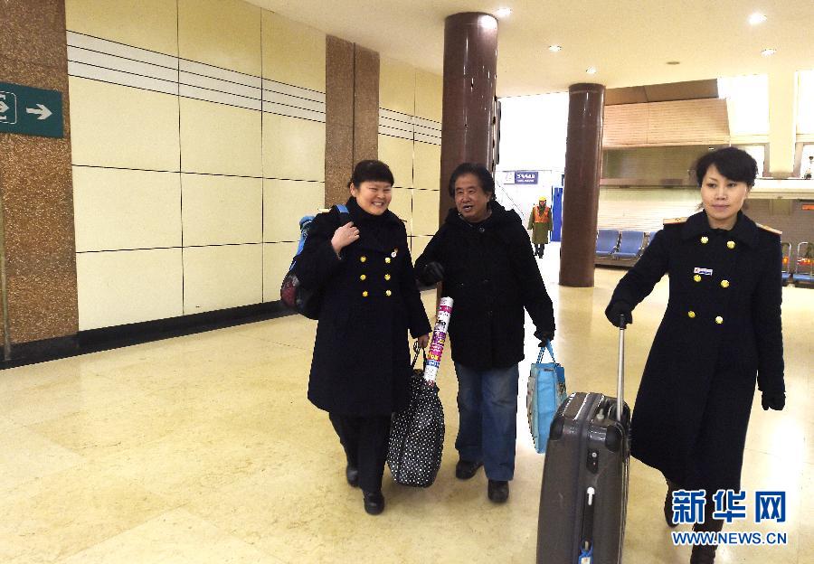 2月13日,杨静(左一)和同事送赵从海上车。 新华社记者燕雁摄