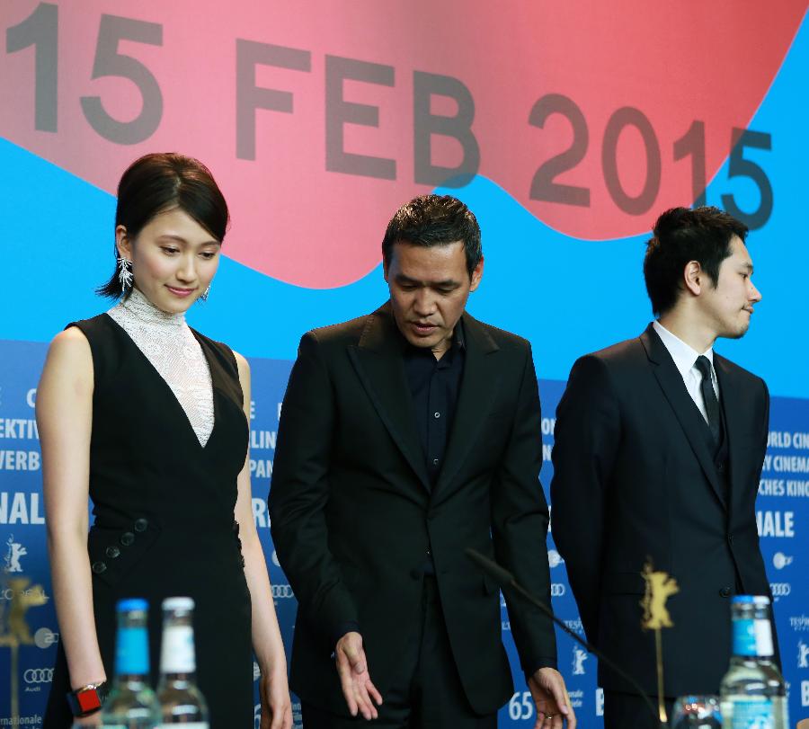 2月13日,在德国柏林,日本导演萨布(中)携影片《天之茶助》主创人员松山健一(右)和大野丝亮相柏林电影节新闻发布会。日本导演萨布导演的影片《天之茶助》入围本届柏林电影节主竞赛单元,参与角逐金熊奖。 新华社记者罗欢欢摄