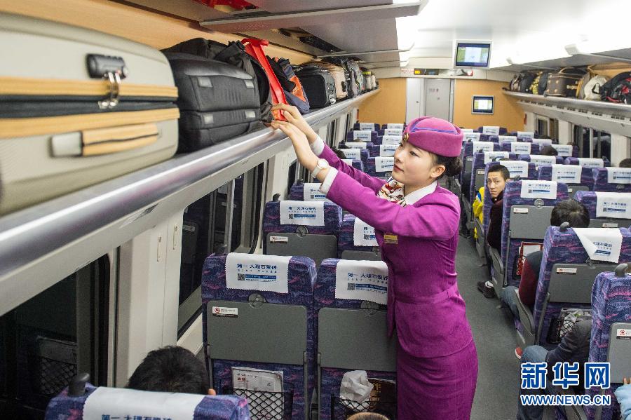 2月12日早晨,D5101次成渝动车上,“90后”动车列车长谭融(右)和动车吧台的乘务员一起为动车挂红灯笼。新华社记者 刘潺 摄