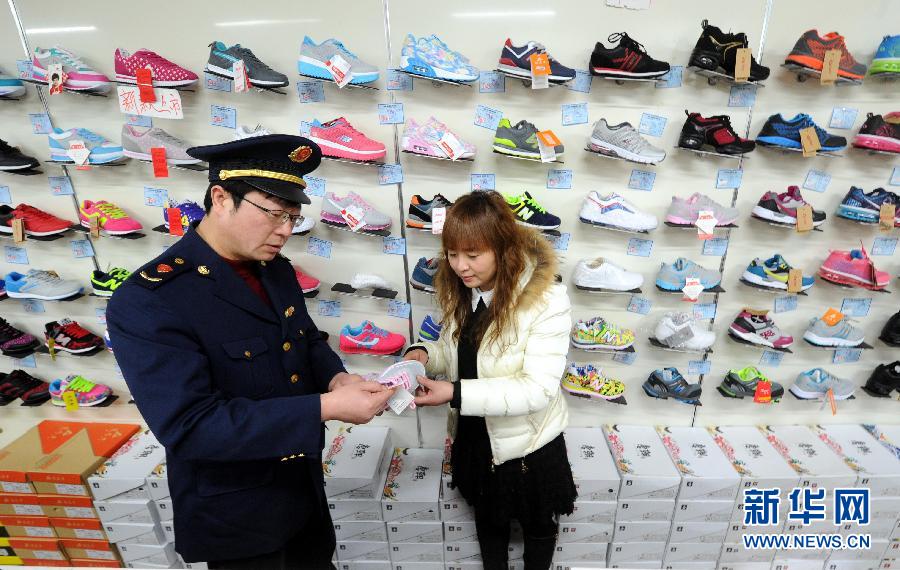 2月13日,大厂回族自治县工商局工作人员在检查鞋的质量。春节临近,河北省大厂回族自治县工商局组织开展“节前市场大检查”专项执法行动,对域内流通领域商品质量进行抽查检验,委托专业机构对商品质量进行鉴定,为消费者营造良好消费环境。新华社记者 李晓果摄