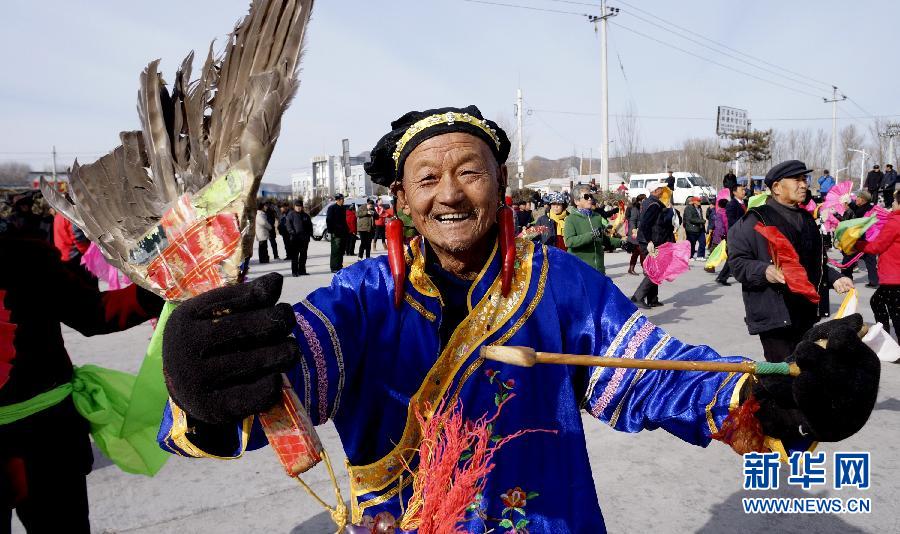 2月13日,延庆县永宁镇的一位老农民装扮起传统秧歌形象在村内广场参加扭秧歌迎春节活动。近期,北京市延庆县开展“送福到家”文化下乡活动,每个乡村都组织了写春联、小春晚、扭秧歌、运动会、贴门神等各具特色、形式多样的文化活动,丰富春节前后农闲时期的农村群众文化生活。新华社记者 李欣 摄