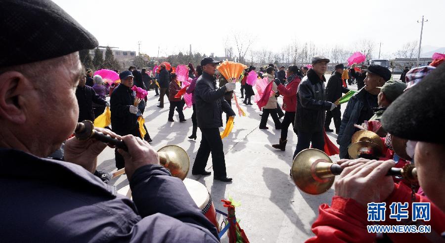 2月13日,延庆县永宁镇的农民在村内广场参加扭秧歌迎春节活动。近期,北京市延庆县开展“送福到家”文化下乡活动,每个乡村都组织了写春联、小春晚、扭秧歌、运动会、贴门神等各具特色、形式多样的文化活动,丰富春节前后农闲时期的农村群众文化生活。新华社记者 李欣 摄