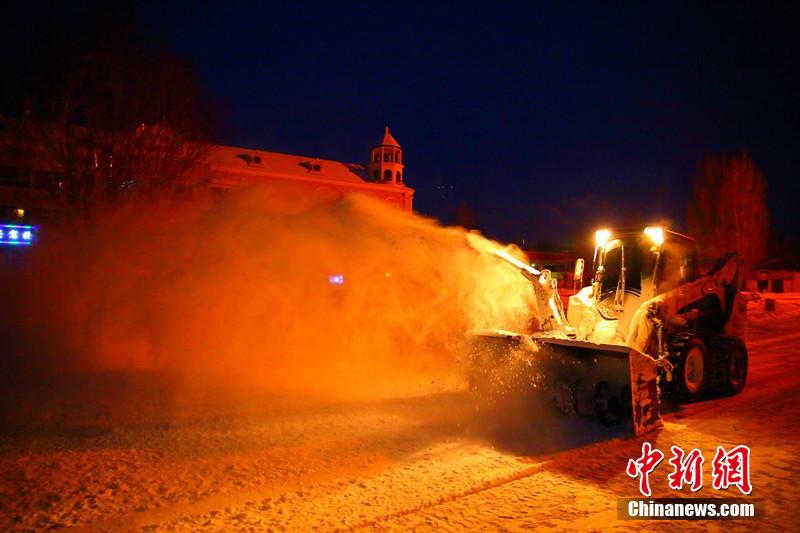 2月12日,受寒潮天气影响,新疆北部阿勒泰、塔城地区普降大雪,最低气温降至零下21摄氏度,当地各级政府及时派出清雪机械清雪,确保当地各族群众出行方便、交通安全。中央气象台预告称,13日,新疆首府乌鲁木齐将降大雪,气温随之下降。 图为2月12日,新疆阿勒泰地区哈巴河县的一辆清雪机械正在清雪。刘是何 摄