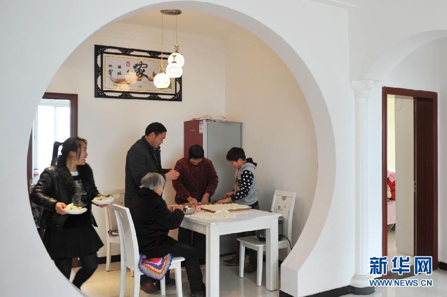 山阳县移民搬迁户熊兴良一家在高坝移民小区新居内准备饭菜过小年(2月12日摄)。截至2014年12月底,陕西南部的汉中、安康、商洛三地市约22万户60多万群众,告别大山深处的土坯、石板危房,搬迁到了城镇居住生活,三地市提升城镇化率6.99个百分点。春节临近,新建成的移民安置区域春节货源充足,迎来了当地移民的春节采购潮,搬迁户将在亮堂的新居度过春节。新华社记者 陈昌奇摄