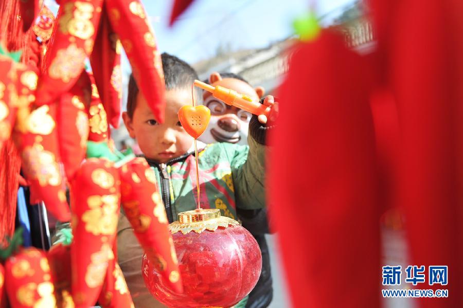 一移民搬迁户儿童在山阳县高坝移民小区市场挑选喜爱的灯笼(2月12日摄)。截至2014年12月底,陕西南部的汉中、安康、商洛三地市约22万户60多万群众,告别大山深处的土坯、石板危房,搬迁到了城镇居住生活,三地市提升城镇化率6.99个百分点。春节临近,新建成的移民安置区域春节货源充足,迎来了当地移民的春节采购潮,搬迁户将在亮堂的新居度过春节。新华社记者 陈昌奇摄