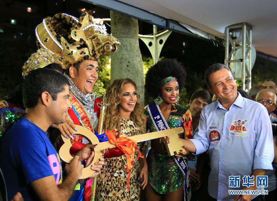2月12日,在巴西萨尔瓦多市,狂欢节国王“莫莫王”(左二)接过城市钥匙,宣告萨尔瓦多狂欢节正式开始。当日,巴西萨尔瓦多市2015年狂欢节开幕。新华社记者张强摄
