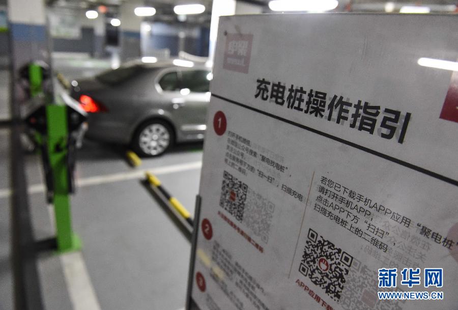 2月13日,一辆汽车停放在北京华贸写字楼地下四层的公用充电桩停车位。据北京市科委介绍,2014年北京已建成1425个公用充电桩,初步实现五公里半径覆盖;2015年北京将优化、扩充公用充电桩规模,预计年内数量同比增长一倍。新华社记者 罗晓光 摄