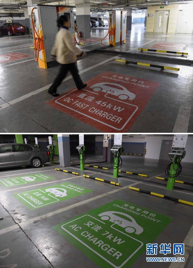 这是一张拼版照片:上图为位于北京华贸写字楼地下四层的电动汽车直流电充电区(2月13日摄);下图为位于北京华贸写字楼地下四层的电动汽车交流电充电区(2月13日摄)。据北京市科委介绍,2014年北京已建成1425个公用充电桩,初步实现五公里半径覆盖;2015年北京将优化、扩充公用充电桩规模,预计年内数量同比增长一倍。新华社记者 罗晓光 摄