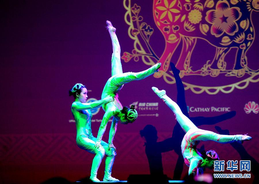 2月12日,在意大利罗马音乐公园,湖南杂技艺术团演员表演杂技。当日,由陕西歌舞艺术团和湖南杂技艺术团带来的“欢乐春节”文艺演出在意大利罗马音乐公园上演,优美的舞蹈和精彩的杂技表演博得现场观众的喝彩。新华社记者许逆之摄
