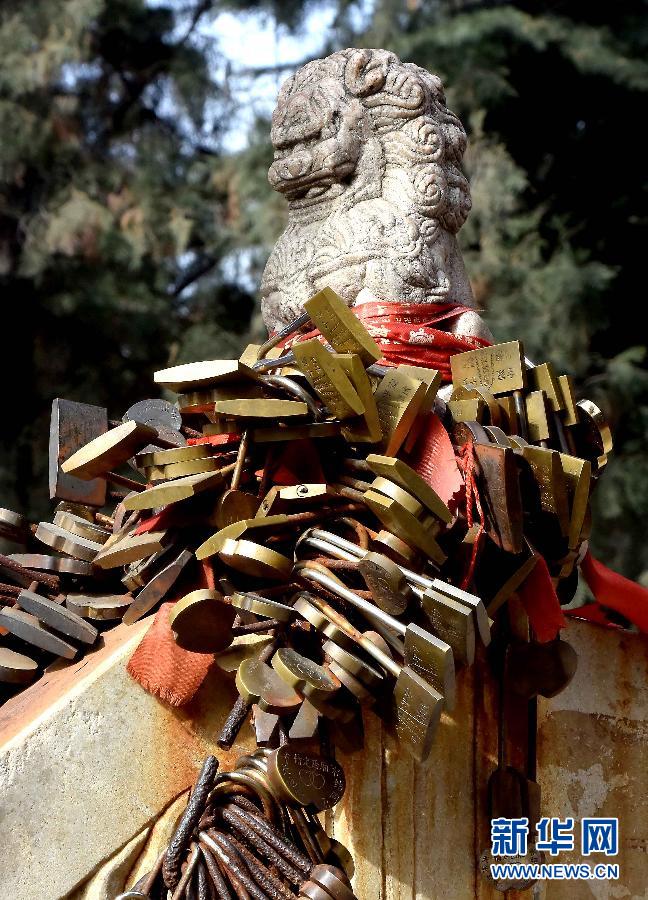 系挂在山西省永济市普救寺内石栏杆上的“同心锁”(2014年12月15日摄)。在中国各地的许多风景区,无论是山路旁的铁链还是桥上的护栏,都能看到系挂着的一把把写有“永结同心”字样、并刻有男女双方姓名的“同心锁”,密密麻麻,环环相扣,成为一道独特的景观。 “同心锁”是一个虔诚的祈祷,更是一个永恒的承诺。相爱的人期盼的是“锁”上两人一生一世的爱恋,用这把“同心锁”见证他们最忠贞、最真诚的爱情。新华社记者 王颂摄