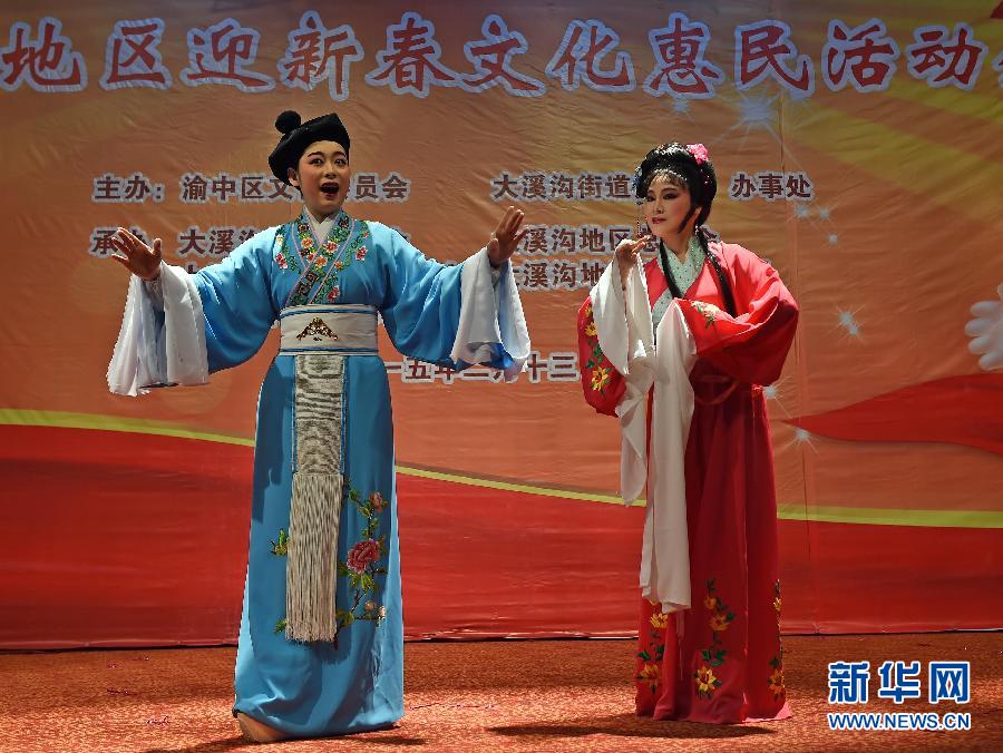 2月13日,在重庆市渝中区大溪沟街道,演员在表演越剧《唐伯虎点秋香》。当日,重庆市渝中区为营造欢乐祥和的节日氛围,落实文化民生,在大溪沟街道举办了迎新春文化演出,通过歌舞、小品、乐器演奏等丰富多彩的表演形式,让全区群众共享文化建设的成果。新华社记者 陈诚 摄