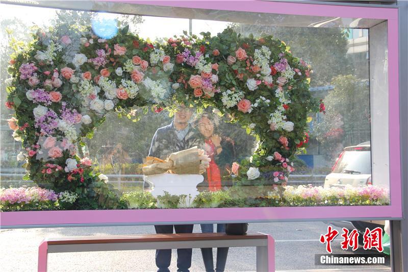 2月12日,情人节将至,浙江省宁波市一鲜花公交车站亮相宁波街头,很多市民围着公交车站拍照留念。据悉,这是一家广告公司为情人节设计的橱窗。制作公司员工说,这个橱窗用了上千朵仿真玫瑰,价值一万多元。林波 摄