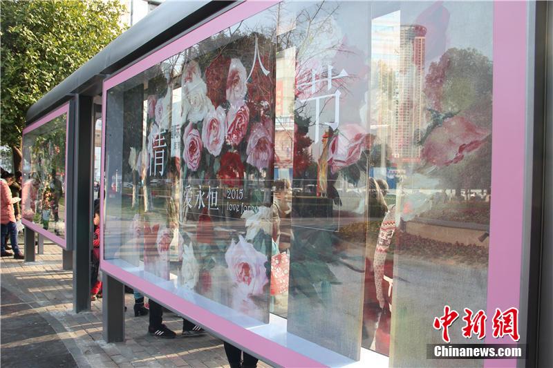 2月12日,情人节将至,浙江省宁波市一鲜花公交车站亮相宁波街头,很多市民围着公交车站拍照留念。据悉,这是一家广告公司为情人节设计的橱窗。制作公司员工说,这个橱窗用了上千朵仿真玫瑰,价值一万多元。林波 摄
